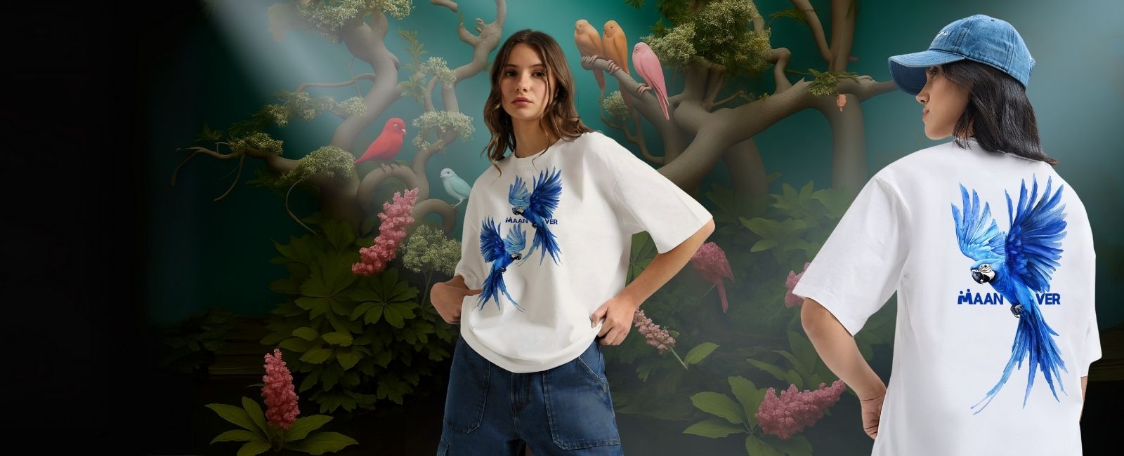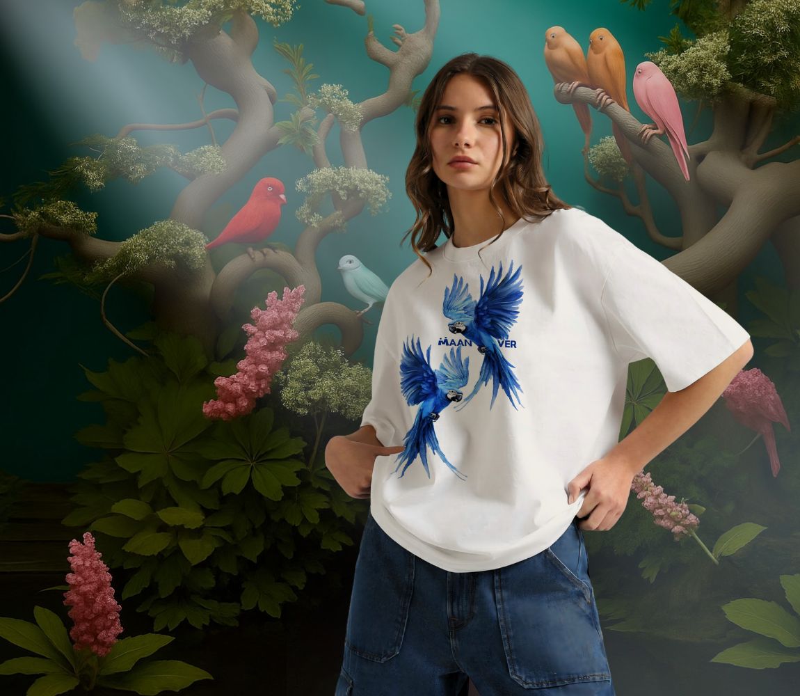 White Blue Parrot Graphic Oversized T-Shirt – Trendy Streetwear Style